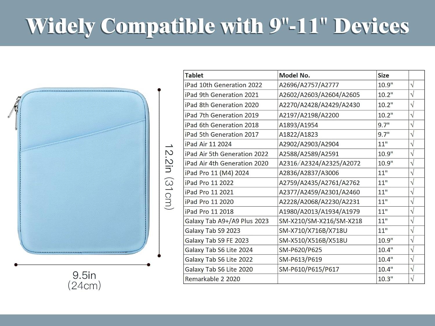 COMPATIBILITY – Designed for 9-11 inch tablets, this tablet bag is compatible with iPad 11-inch A16 2025 (11th Generation), iPad 10th Generation (10.9″), iPad 9th/8th/7th Gen. (10.2″), iPad Air 11 (M3 2025/M2 2024), iPad Air 5th/4th Gen. (10.9″), iPad Pro 11″, Galaxy Tab A9+/A9 Plus 11″, Galaxy Tab S9 11″/S9 FE 10.9″, Galaxy Tab S6 Lite 10.4″, Remarkable 2 10.3″.