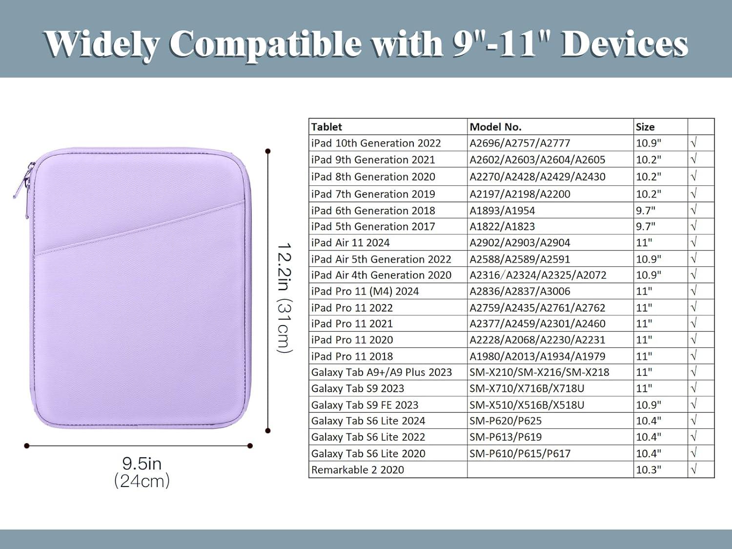 COMPATIBILITY – Designed for 9-11 inch tablets, this tablet bag is compatible with iPad 11-inch A16 2025 (11th Generation), iPad 10th Generation (10.9″), iPad 9th/8th/7th Gen. (10.2″), iPad Air 11 (M3 2025/M2 2024), iPad Air 5th/4th Gen. (10.9″), iPad Pro 11″, Galaxy Tab A9+/A9 Plus 11″, Galaxy Tab S9 11″/S9 FE 10.9″, Galaxy Tab S6 Lite 10.4″, Remarkable 2 10.3″.