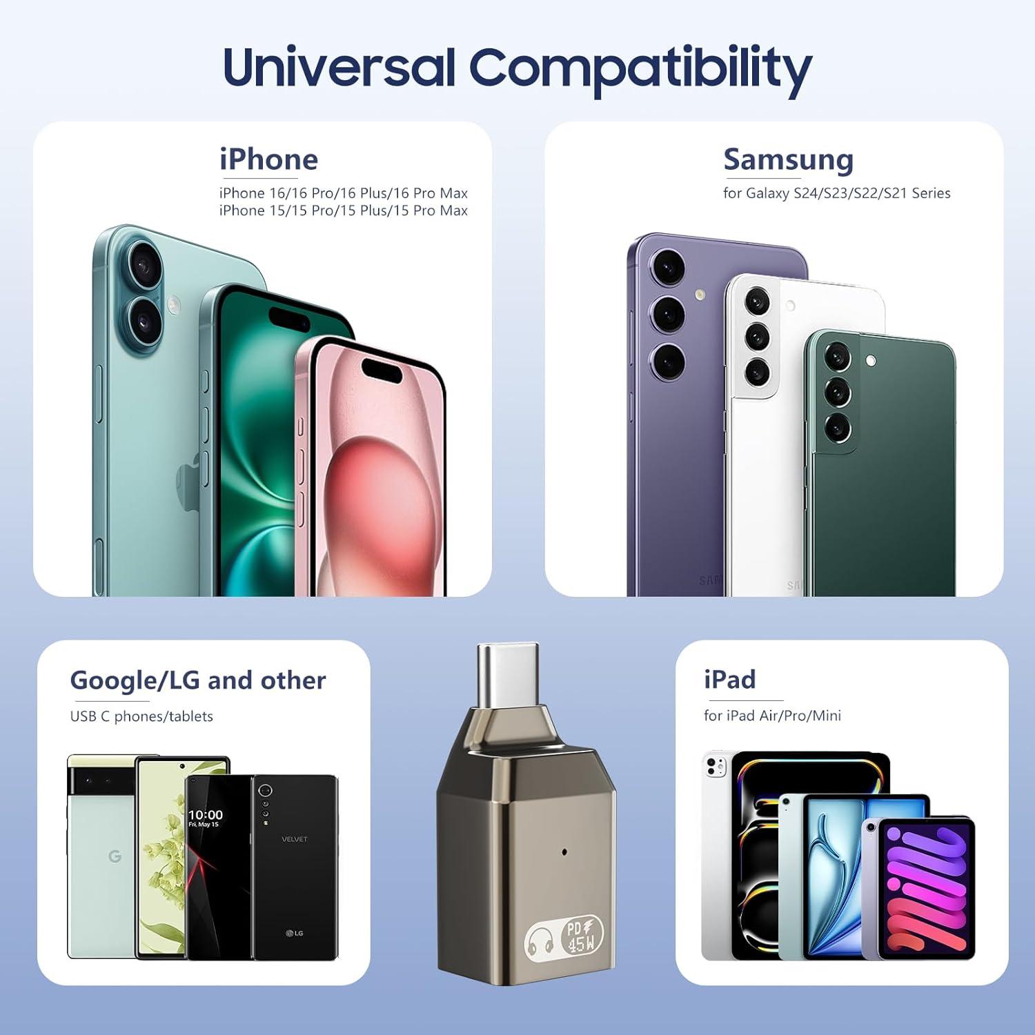 Wide Compatibility: The lightning to usb c adapter audio is compatible with most USB-C devices: iPhone 16 15/Pro/Plus/Pro Max, iPad Pro 13/11 2024, iPad Air 13/11 2024, iPad Mini 6, iPad Pro 12.9/11'', iPad Air 5/4, iPad 10th Gen 2022, Galaxy S24/S24+/S24 Ultra/S23/S23+/S23 Ultra/S22/S22+/S22 Ultra/S21/S21+/S21 Ultra, MacBook Pro/Air, Dell, Google Pixel.