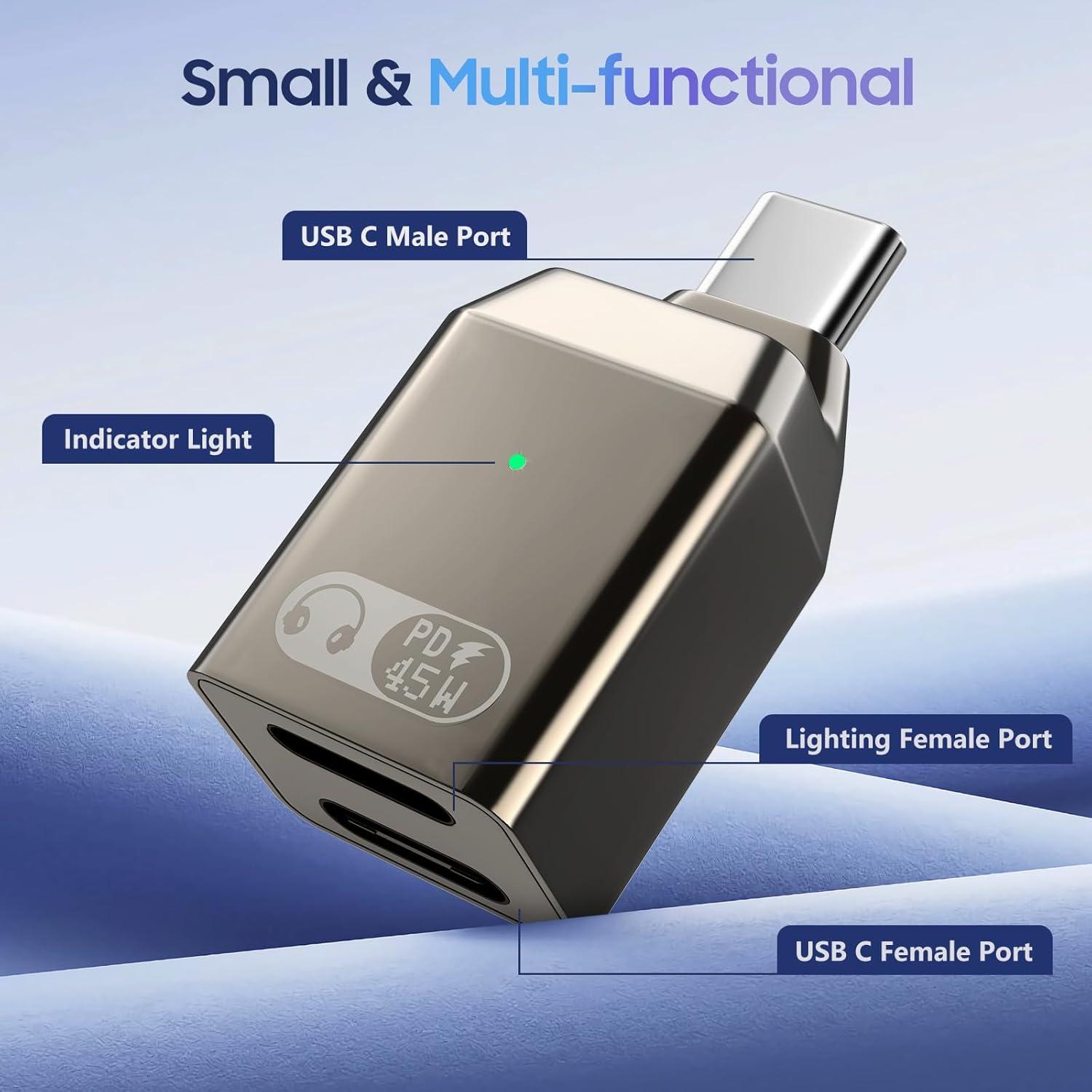 2 in 1 Listening While Charging: The usb c to lightning headphone adapter converts type-c port to a lightning audio port and a type-c charging port. Dual ports allow you to connect your iPhone headphone with USB C device, and charge it while listening to music, watching videos, or making phone calls. Note: Lightning female port only supports headphone, and USB C female port only supports charging.