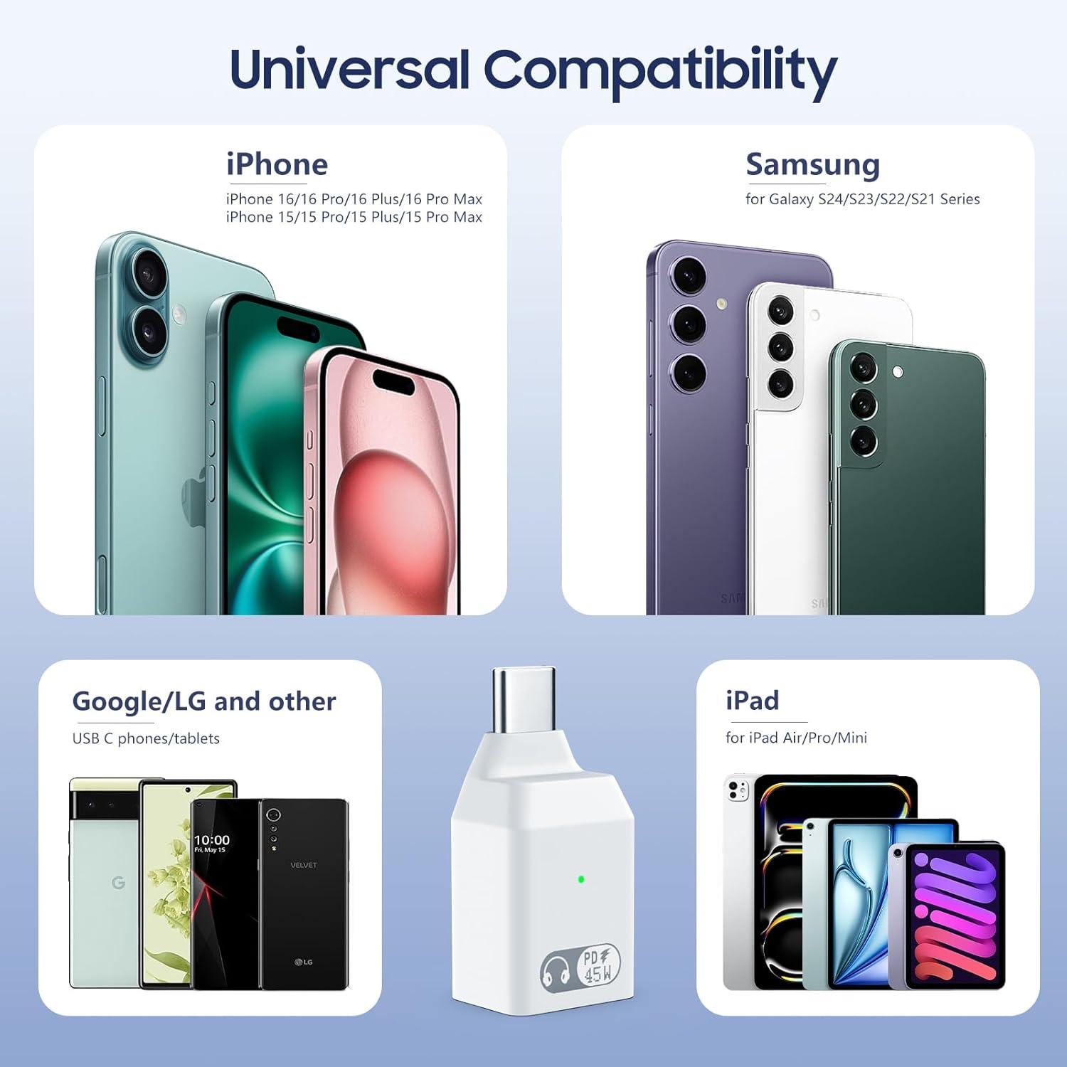 Wide Compatibility: The lightning to usb c adapter audio is compatible with most USB-C devices: iPhone 16 15/Pro/Plus/Pro Max, iPad Pro 13/11 2024, iPad Air 13/11 2024, iPad Mini 6, iPad Pro 12.9/11'', iPad Air 5/4, iPad 10th Gen 2022, Galaxy S24/S24+/S24 Ultra/S23/S23+/S23 Ultra/S22/S22+/S22 Ultra/S21/S21+/S21 Ultra, MacBook Pro/Air, Dell, Google Pixel.