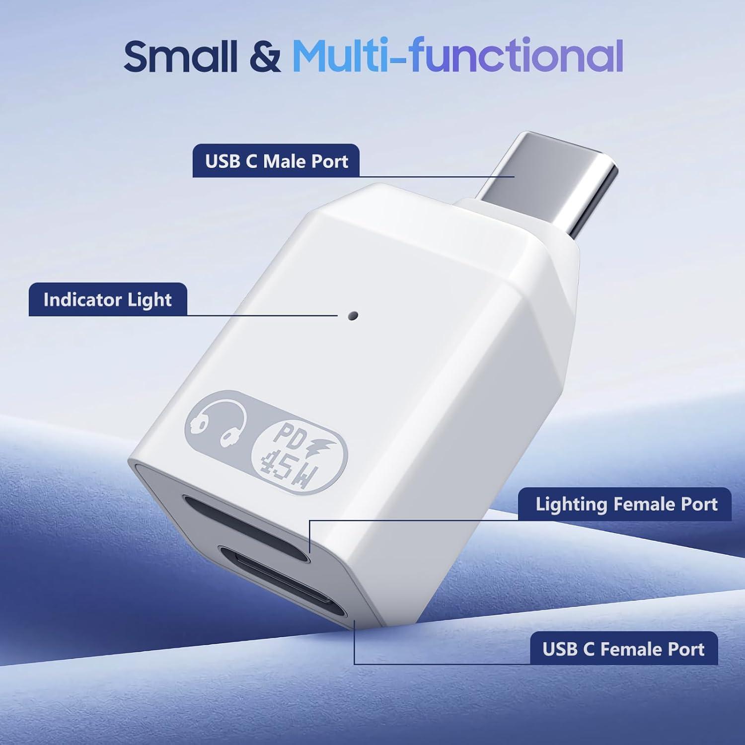 2 in 1 Listening While Charging: The usb c to lightning headphone adapter converts type-c port to a lightning audio port and a type-c charging port. Dual ports allow you to connect your iPhone headphone with USB C device, and charge it while listening to music, watching videos, or making phone calls. Note: Lightning female port only supports headphone, and USB C female port only supports charging.