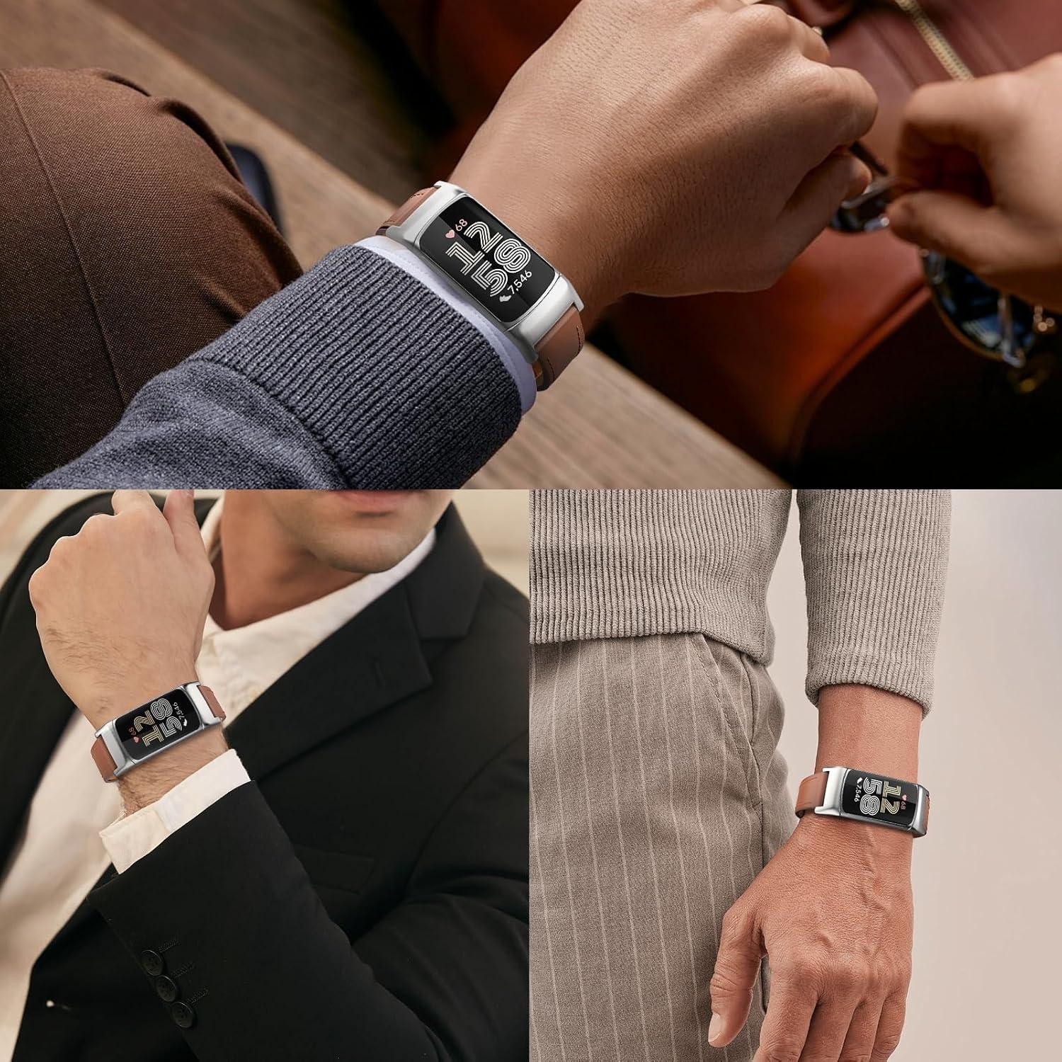 TiMOVO Leather Band Compatible with Fitbit Charge 6/Fitbit Charge 5 Watch Bands, Top Grain Genuine Classic Leather Replacement Wristbands Straps for Women Men, Black(Brown)