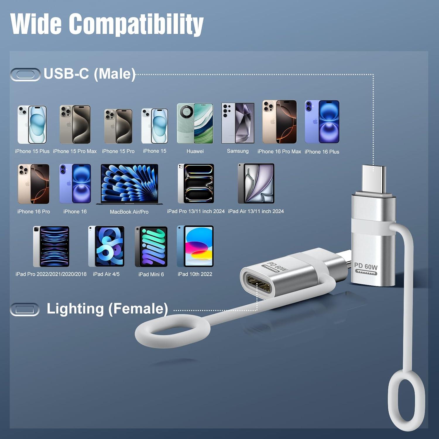 Widely Compatible: The usb c male to lightning female adapter is compatible with all Type C devices: iPhone 16/16 Plus/16 Pro/16 Pro Max, iPhone 15/15 Plus/15 Pro/15 Pro Max, iPad Pro/Air 13-inch 2024, iPad Pro/Air 11-inch 2024, iPad Pro 12.9''/11'', iPad 10th Gen 2022, iPad Air 4/5, Macbook, Chromebook, Surface, Switch, Samsung, Google Pixel, etc.