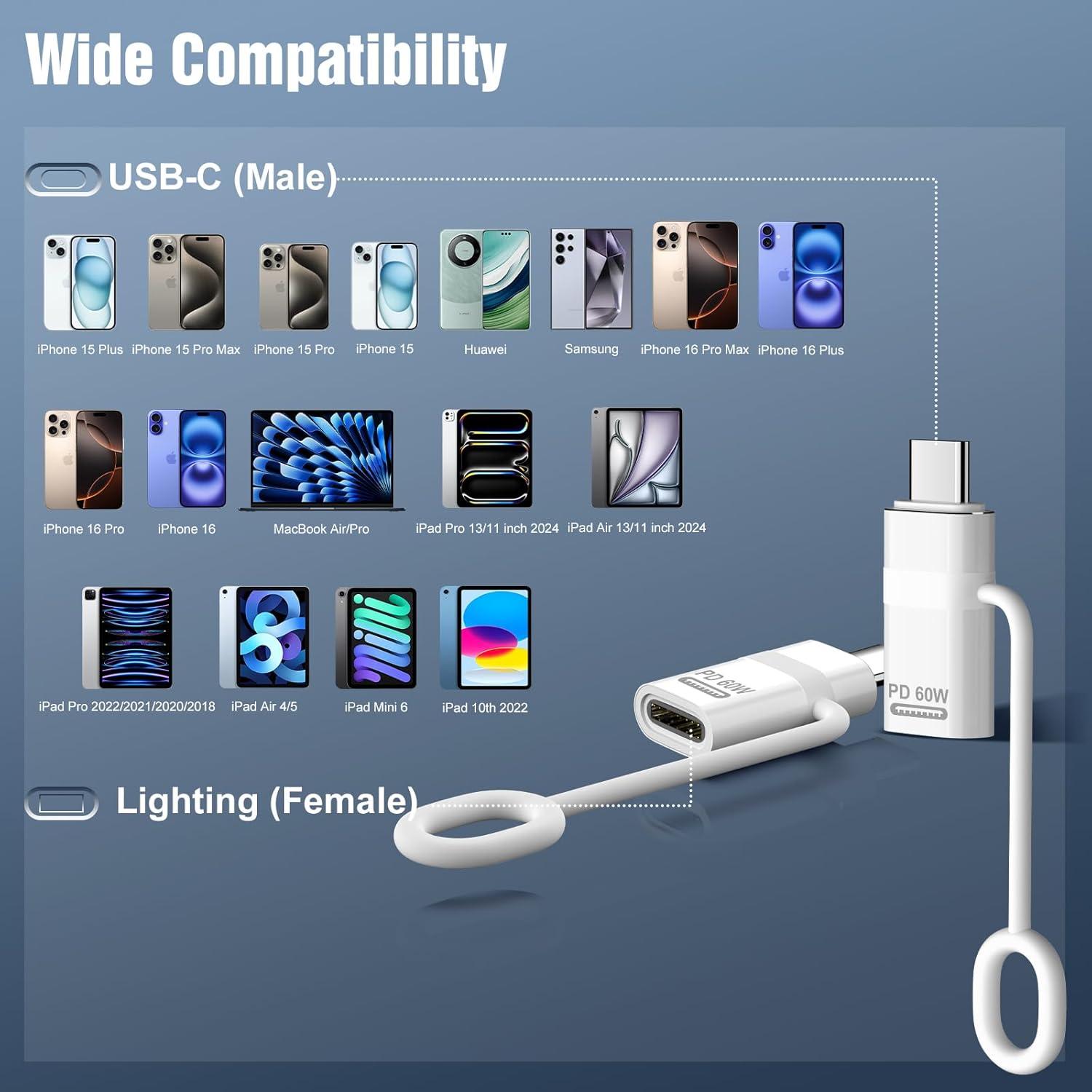 Widely Compatible: The usb c male to lightning female adapter is compatible with all Type C devices: iPhone 16/16 Plus/16 Pro/16 Pro Max, iPhone 15/15 Plus/15 Pro/15 Pro Max, iPad Pro/Air 13-inch 2024, iPad Pro/Air 11-inch 2024, iPad Pro 12.9''/11'', iPad 10th Gen 2022, iPad Air 4/5, Macbook, Chromebook, Surface, Switch, Samsung, Google Pixel, etc.