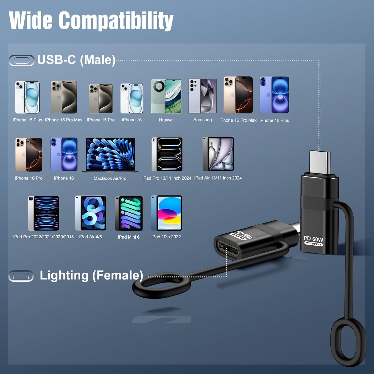 Widely Compatible: The usb c male to lightning female adapter is compatible with all Type C devices: iPhone 16/16 Plus/16 Pro/16 Pro Max, iPhone 15/15 Plus/15 Pro/15 Pro Max, iPad Pro/Air 13-inch 2024, iPad Pro/Air 11-inch 2024, iPad Pro 12.9''/11'', iPad 10th Gen 2022, iPad Air 4/5, Macbook, Chromebook, Surface, Switch, Samsung, Google Pixel, etc.