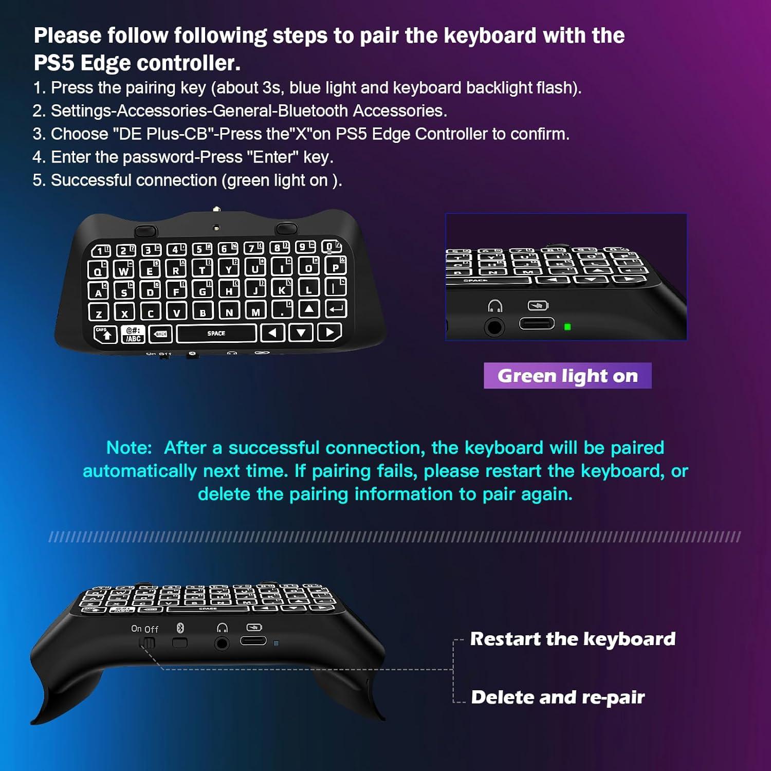 Easy to Connect: Connect the PS5 edge controller first, then turn on the keyboard, press and hold the pairing button on the keyboard (about 3s) until the blue indicator flashes. Pairing steps: Settings—Accessories—General—Bluetooth Accessories—Choose the name of the keyboard “DE Plus-CB”—Press the “X” on PS5 Edge Controller to confirm—Secret key will be displayed on the screen—Input it directly with the keyboard—Press Enter Key to confirm—Completion.